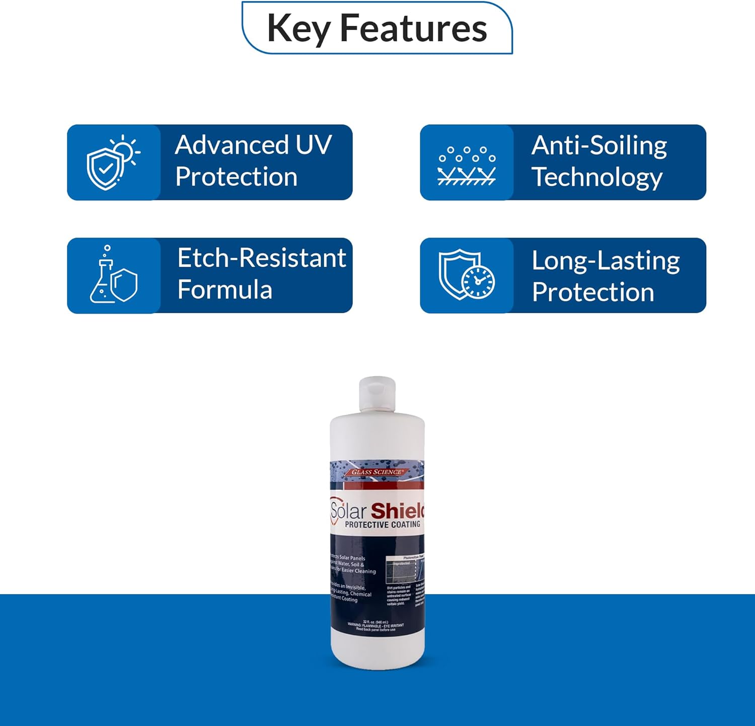 Developed as a transparent polymer coating on a nano scale, SOLAR SHIELD® is ideal for safeguarding glass solar module surfaces. By inhibiting the accumulation of soil, grime, water spots, pollution, minerals, and other contaminants, SOLAR SHIELD® maintains optimal efficiency in solar panels. Furthermore, it expedites frost and snow burn off, as rain alone is not sufficient in keeping solar modules clean and preventing soiling or etching. With a coverage of over 1000 square feet per 32 oz bottle, this 12-pack of SOLAR SHIELD® will effectively protect at least 12,000 square feet of surface.
