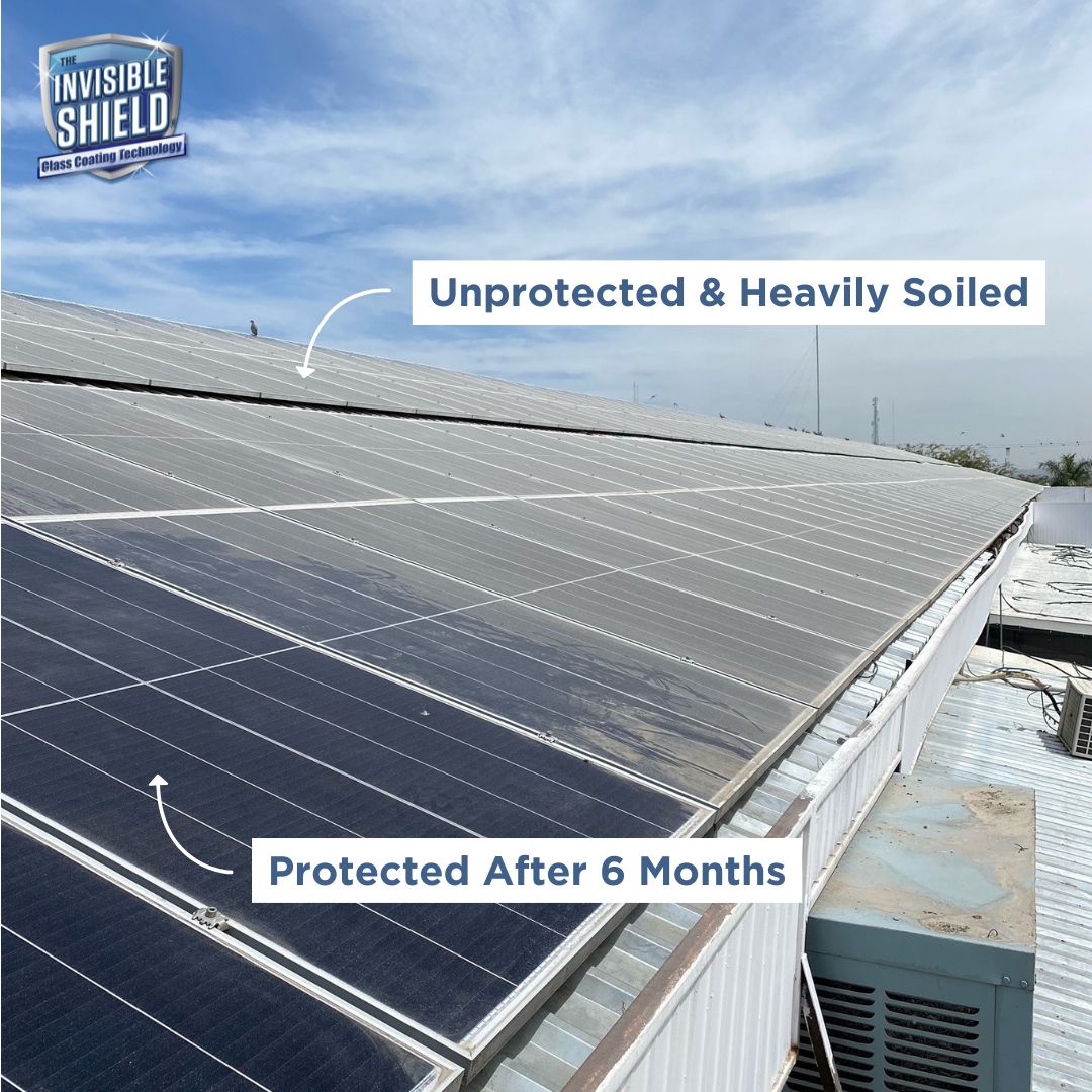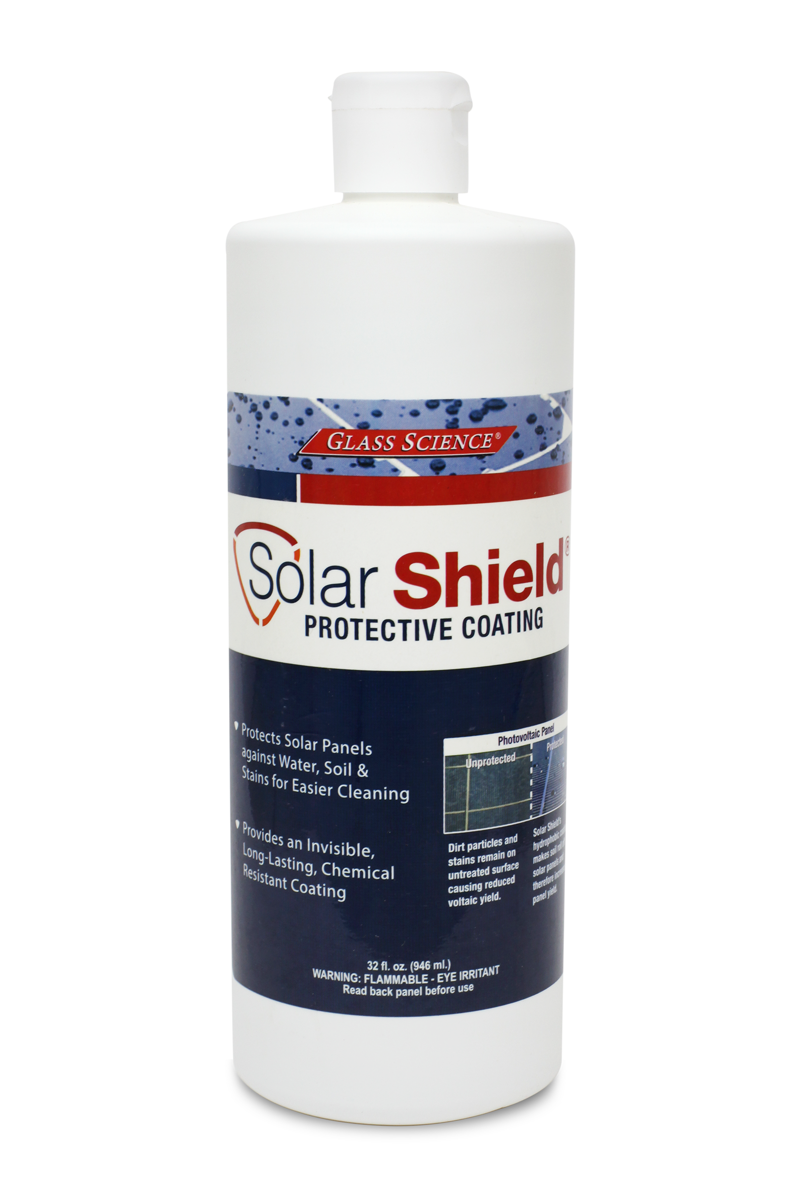 SOLAR SHIELD® is an innovative, nanoscale coating that effectively safeguards glass solar modules from soil, grime, water spots, pollution, minerals, and other contaminants. This transparent polymer coating ensures optimal efficiency by preventing adhesion and buildup on the surface. Additionally, SOLAR SHIELD® speeds up the melting process for frost and snow, as rain alone is not enough to keep solar panels clean and prevent soiling or etching. With a coverage of 1000+ square feet per 32 oz bottle, SOLAR SHIELD® is a cost-effective solution for maintaining the efficiency of your solar modules.